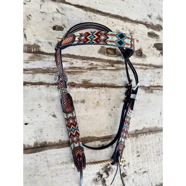 Crafted from high quality Harness leather, this bridle features a beautiful two-tone finish and striking Aztec beaded 8nlaysthat bring colour, culture and character to the piece.