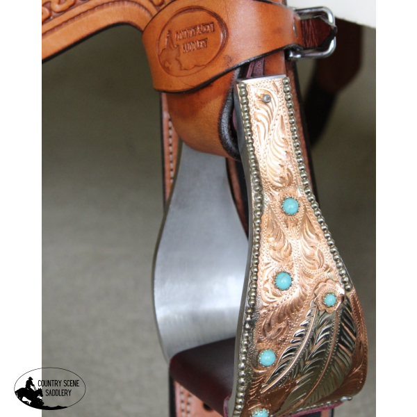 Expertly crafted from lightweight, durable aluminum, these stirrups are designed for lasting performance and rider security. The copper-toned overlay, elegantly engraved with beautiful detailing and accented with turquoise delivers a stunning western flair that turns heads both in the arena and on the trail.