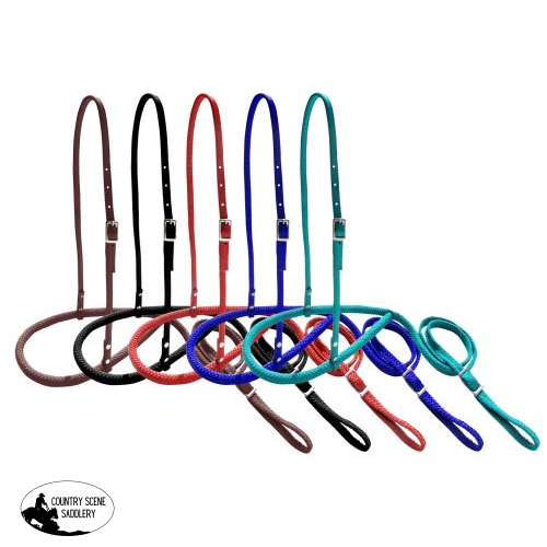 Showman ® Premium nylon rope nose tiedown. 1" Premium round braided rope noseband with nickel plated hardware.