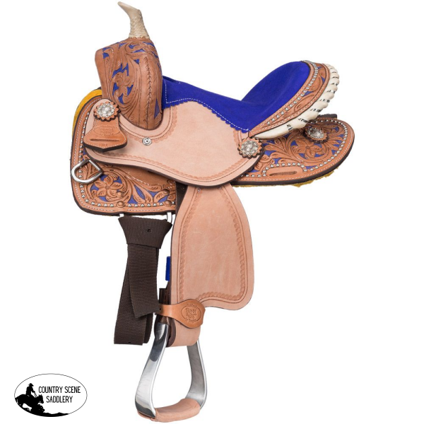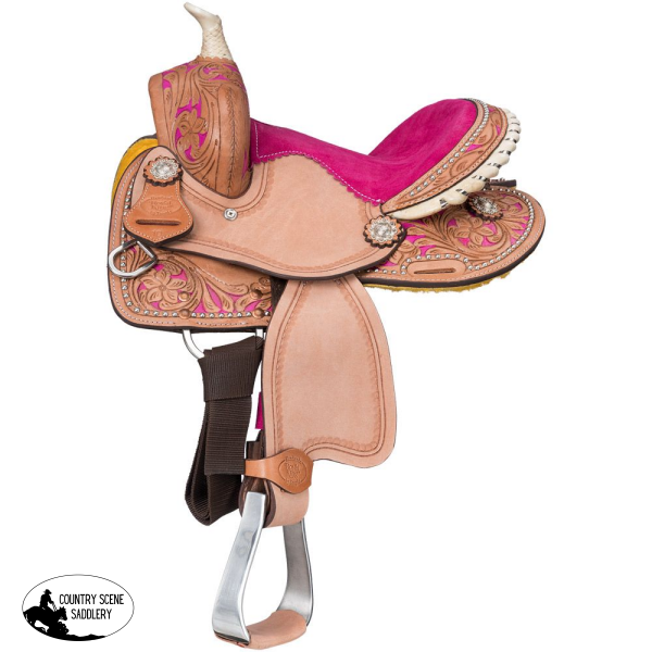 The Pasadena Youth Barrel Saddle will have your child riding high! This saddle features hand-carved floral patterns with a dark background to match the luxurious padded suede seat. The overall look is further enhanced with silver dot accents, a rawhide braided horn and a rawhide cantle with stainless steel lacing detail. Along with the suede seat, this saddle has a roughout fender and jockey which work together to provide a secure seat for your child. Other features include lightweight aluminum stirrups, close contact in-skirt rigging, durable nylon tie strap/off billet and Blevins style stirrup buckles.