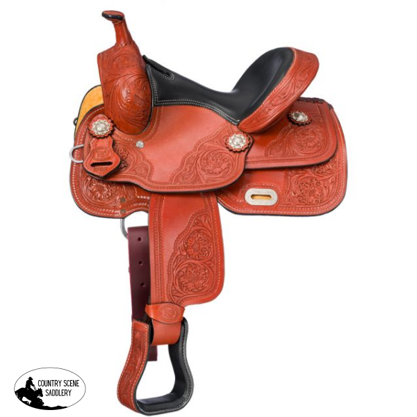 Looking for your next everyday saddle? Look no further than the Royal King Ridgeline! This saddle features a smooth leather seat that is nicely padded for comfortable all-day riding. The rich medium oil finish is adorned with hand carved floral and border tooling for a traditional western look. This saddleβs close contact skirt and in-skirt rigging allows you to feel closer to your horse. Complete with leather wrapped stirrups with padded tread, silver engraved conchos for a touch of shine and quick change fender buckles.