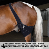 These stifle wraps are the perfect red light therapeutic solution for sore stifles. Crafted from a self-adhering neoprene with an adjustable hook-and-loop for a custom fit, they secure in place with an adjustable strap around the hips. With this stifle wrap, your horse will be provided ample coverage for optimal effectiveness in preventing, maintaining, and treating injuries and chronic conditions.