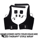 The kit includes the case, (2) stifle wraps, (2) batteries, and chargers. Battery packs with hook and loop backing adhere to the wrap during use, eliminating tangled cords.