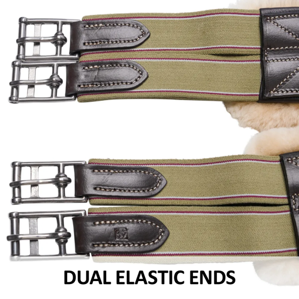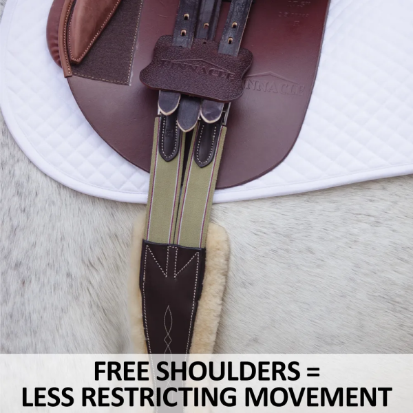 The cutouts around the elbow allow for more freedom and range of motion when your horse is in full stride. The center of the girth measures 5 1/4" wide, tapering to 2 1/4" at the elbow and widening back out to 3 1/4" at the ends.