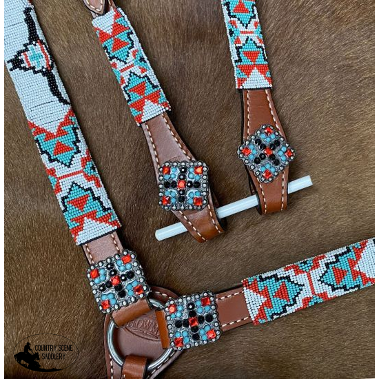 Showman ® 4pc. Longhorn beaded one headstall and breast collar set with square bling concho accents. Comes with Wither strap and competition reins. This set features medium leather with a beaded aztec pattern inlay featuring a longhorn design. Set is accented with square bling Conchos and silver hardware. Headstall comes with matching competition reins and wither strap.