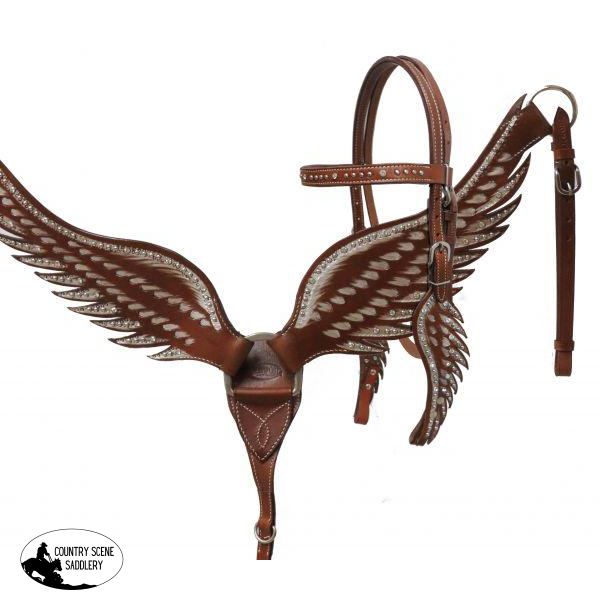 Showman ® Angel wing headstall and breast collar set. This set features medium oil leather with cut out angel wings on breast collar and cheeks and are accented with crystal rhinestones, silver studs and metallic silver paint. Headstall comes with 5/8" x 7' leather split reins.