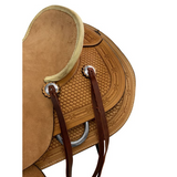 The intricate detail on this saddle is stunning, featuring a small rope basket weave tooled skirt and swell with a barbwire border. Completed with white stitched edges, front D-rings, a leather off-billet, and silver conchos with long saddle strings for attaching gear.Β