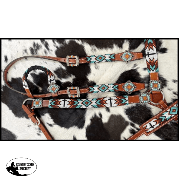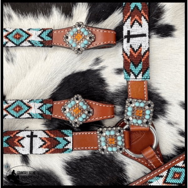 Showman ® Beaded Cross & Southwest Design 4 Piece Set. This set features medium leather with a with a Southwest beaded overlay with brown, turquoise, and white beads. Set is accented with silver conchos with orange & turquoise beads as well as on buckles. Set comes with single ear headstall, breastcollar, wither strap, and contest reins.