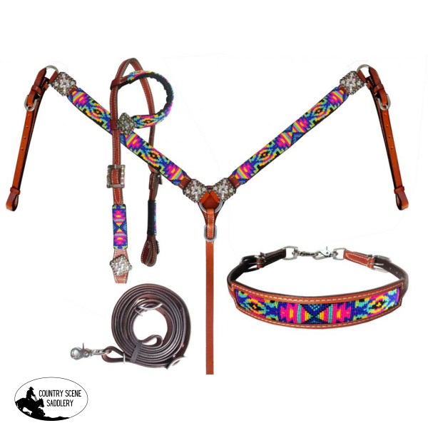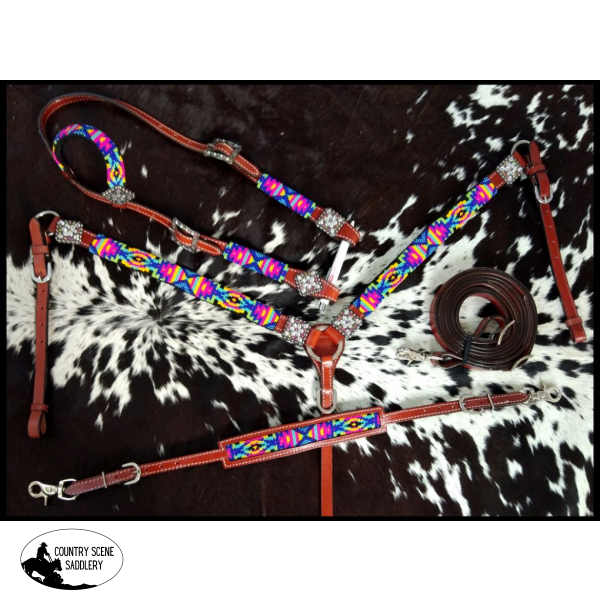 Showman ® Beaded Bright Colored Tribal Design 4 Piece Headstall and Breastcollar Set. This set features medium leather with a beaded tribal overlay with bright colored beads. Set is accented with silver Conchos with clear/ iridescent stones and buckles. Set comes with One ear headstall, breastcollar, wither strap, and contest reins.