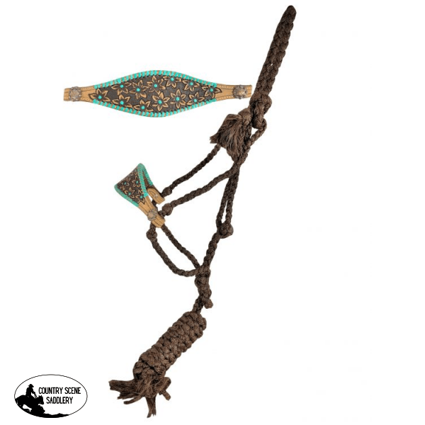 Showman® Woven Brown nylon mule tape halter with tooled medium oil flower noseband. Features teal rawhide whip stitch edges. This mule tape style halter features woven nylon with a removable 8' lead. This halter has tassel ends at the tie point and tassels on the removable lead. Halter is lightweight and excellent for groundwork or any other in-hand training.