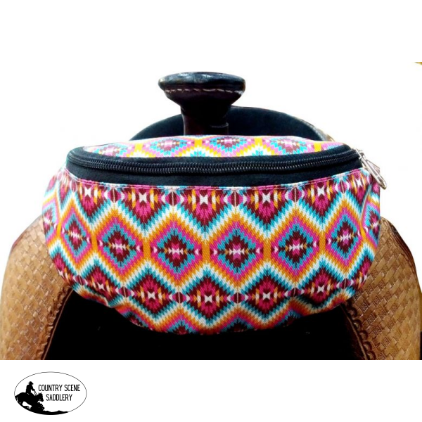 Showman ® Bright Aztec Horse Print Insulated Nylon Saddle Pouch. Includes two convenient pockets that are ideal for your phone, keys, money, snacks, etc. Simply clip the saddle pouch to the pommel of your saddle with two buckles. Measures 8.5" long by 3.5" wide by 4.5" tall