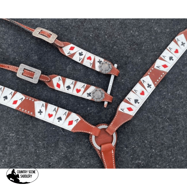 Showman ® "Four of A Kind" Print One Ear Headstall and Breast collar Set. This set features medium leather with a "Four of a Kind" print overlay. Set includes one ear headstall, breast collar, and 5/8" x 7' split reins.