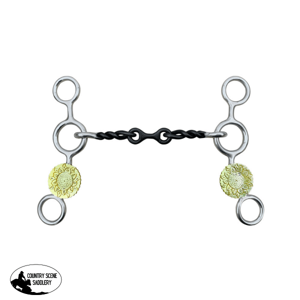The Showman Golden Harvest Stainless Steel JR Cowhorse Bit with Twisted Snaffle and Dog Bone Center, a top-quality equestrian accessory designed to give your horse more response time and mild leverage. Crafted from durable stainless steel, this bit features a twisted snaffle with a dog bone center, and a brass sunflower design on the shank, providing gentle yet effective control. The twisted snaffle aids in lateral flexion and encourages responsiveness, while the dog bone center serves to apply pressure evenly on the horses tongue, encouraging a balanced response from the horse. With its sleek design and superior craftsmanship, this bit is a must-have for any serious equestrian.