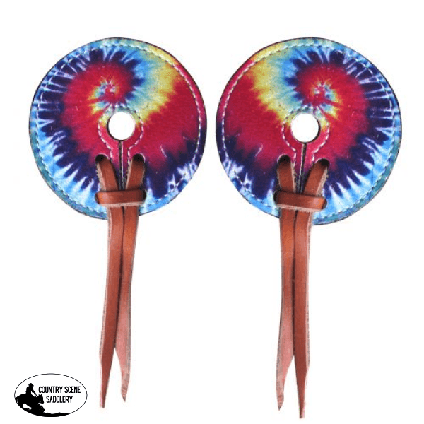 Tie Dye Bit Guards. 3" wide printed leather with leather strap closure. Durable, soft and flexible to keep the horse comfortable and prevent the bit from rubbing.