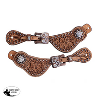 Showman ® LADIES SIZE crystal rhinestone spur straps with floral tooling. These leather spur straps feature floral tooled leather and antique style hardware accented with crystal rhinestone conchos and buckles and trimmed in crystal rhinestone studs.