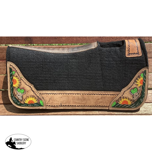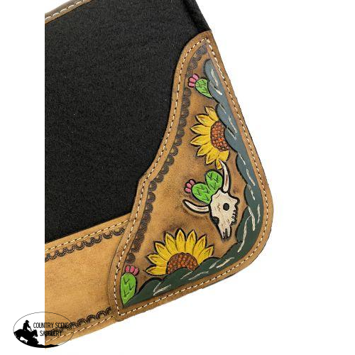 Showman® Pony 24" x 24" Black felt 1” saddle pad with distressed brown leather featuring hand painted cactus, skull & sunflower designs. This pad features distressed brown wear leathers with the hand painted designs in beautiful colors. Saddle pad has vented wither and a leather reinforced spine.
