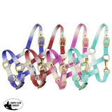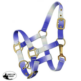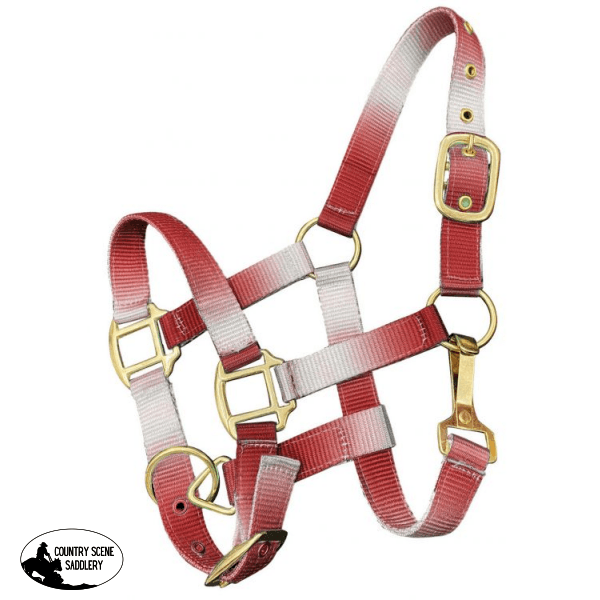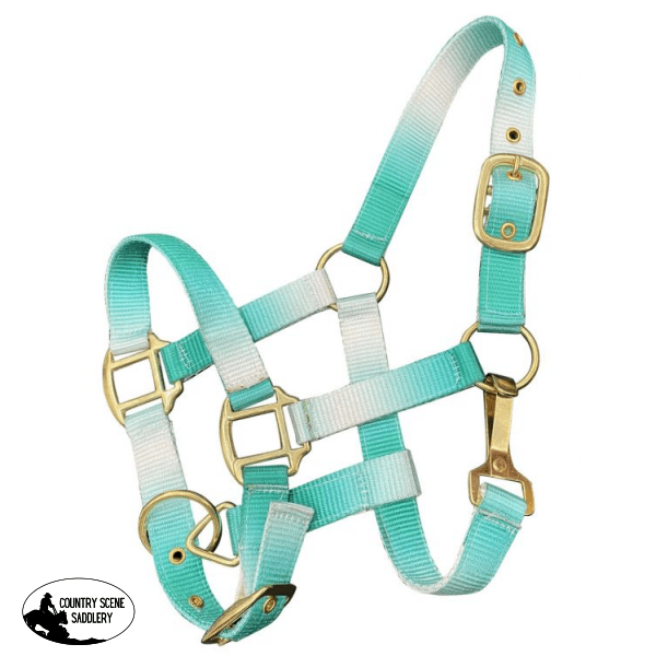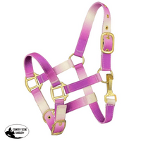 Showman ® Premium nylon Pony sized ombre halter with nickel plated hardware. This nylon halter features adjustable crown and noseband.