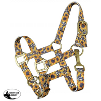 Showman ® Premium sunflower & cheetah print nylon halter with brass hardware. This nylon halter features adjustable crown and noseband.