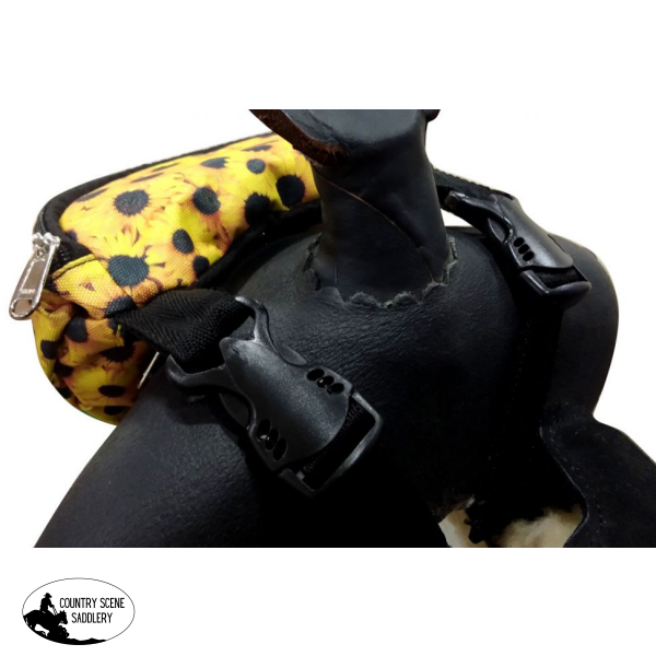 Showman ® Sunflower Print Insulated Nylon Saddle Pouch. Includes two convenient pockets that are ideal for your phone, keys, money, snacks, etc. Simply clip the saddle pouch to the pommel of your saddle with two buckles. Measures 8.5" long by 3.5" wide by 4.5" tall.