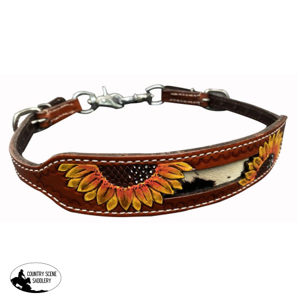 Showman ® Leather wither strap with painted sunflower and hair on cowhide inlay This wither strap features medium oil leather with painted sunflower with black and white cowhide inlay. Easily adjusts with 2 buckles 23"-30"