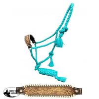 Showman® Woven teal nylon mule tape halter with leaf tooled leather noseband. This mule tape style halter features woven nylon with a removable 8' lead. This halter has tassel ends at the tie point and tassels on the removable lead. Halter is lightweight and excellent for ground work or any other in-hand training.