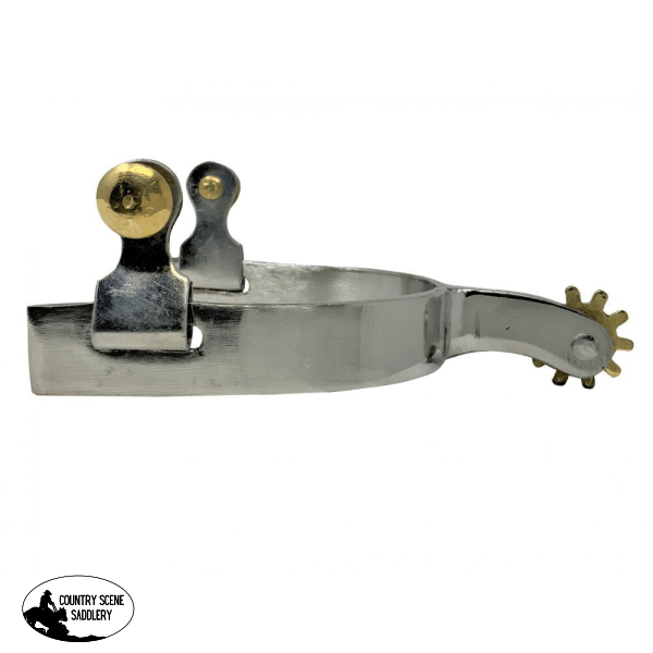 Showman ®Youth size chrome plated western spurs. Features smooth band with brass plated buttons and rowels. Shank: 1 1/2" Band Width: 1/2" Boot Width: 3"