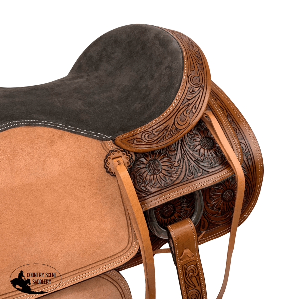Artistically adorned with Sunfire floral tooling, the saddle exudes a unique aesthetic charm that sets it apart from the rest. This intricate design not only enhances the saddle's visual appeal but also showcases the craftsmanship and attention to detail that went into its creation. The floral motifs add a touch of elegance and tradition to the saddle, reflecting a deep appreciation for the classic artistry of saddle making.