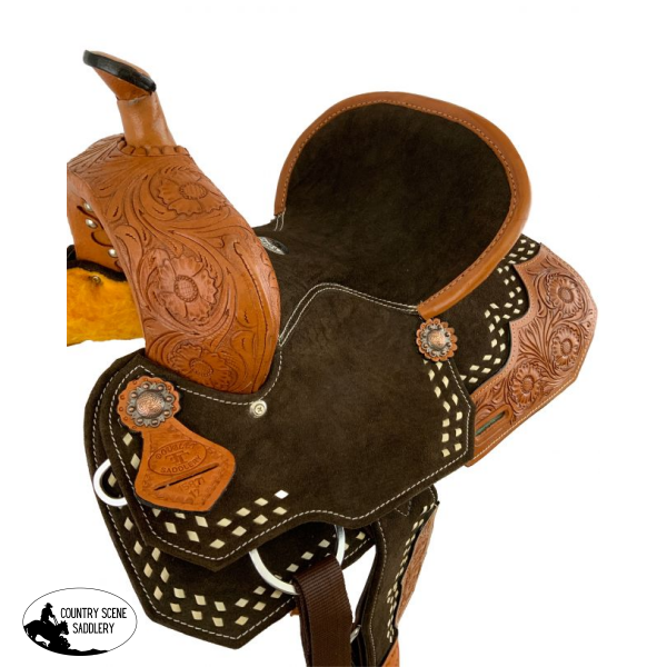 This 12" Double T brown suede barrel saddle has an eye-catching look combining floral tooled leather overlays along with a crisp white buckstitched inlay on the skirts and fenders. Saddle is built on a lightweight rawhide wrapped fiberglass wood tree designed for maximum speed with semi quarter horse bars. It features a deep padded suede seat with a tooled top grain leather pommel and cantle. Suede seat, jockey, fenders, and skirts offer excellent grip for secure and confident riding. Complete with copper conchos, aluminum stirrups with suede bottom, and front D rings.