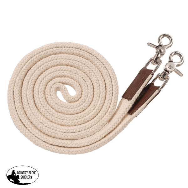 A very popular roping rein for western riders of any discipline! Made of natural super soft braided cotton these reins offer a lightweight, ultra-comfortable feel in the hand. The scissor snap bit ends are reinforced with nylon for extra strength to withstand everyday riding.