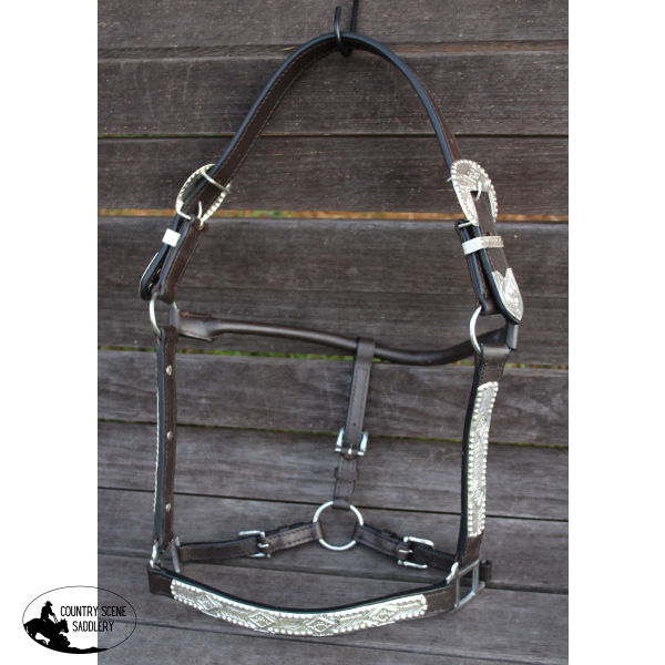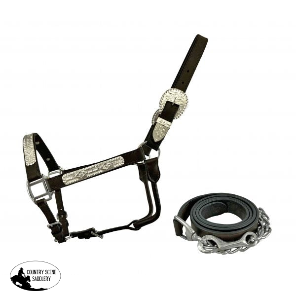 Dark Oil Average Horse size leather double stitched silver bar horse size show halter with 1" X 6' leather lead with matching leadNose 11 1/2 inch Cheek Strap 7 3/4 inch Poll is Adjustable 11 to 17 1/2 inch (hole to hole) (can place more holes if needed) Size are approximately.